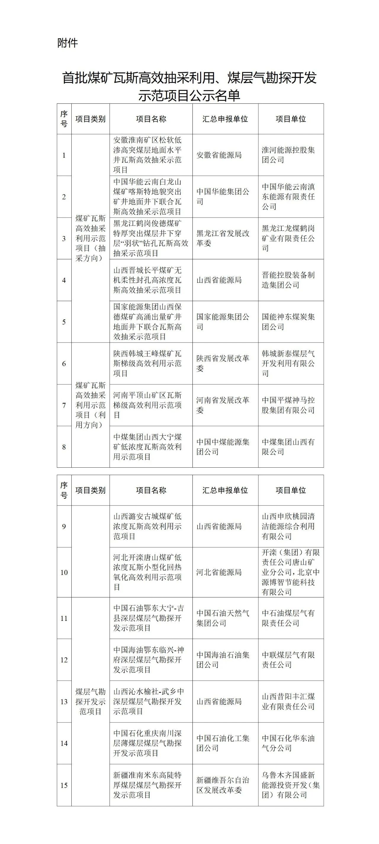 國(guó)家能源局綜合司關(guān)于首批煤礦瓦斯高效抽采利用和煤層氣勘探開(kāi)發(fā)示范項(xiàng)目的公示