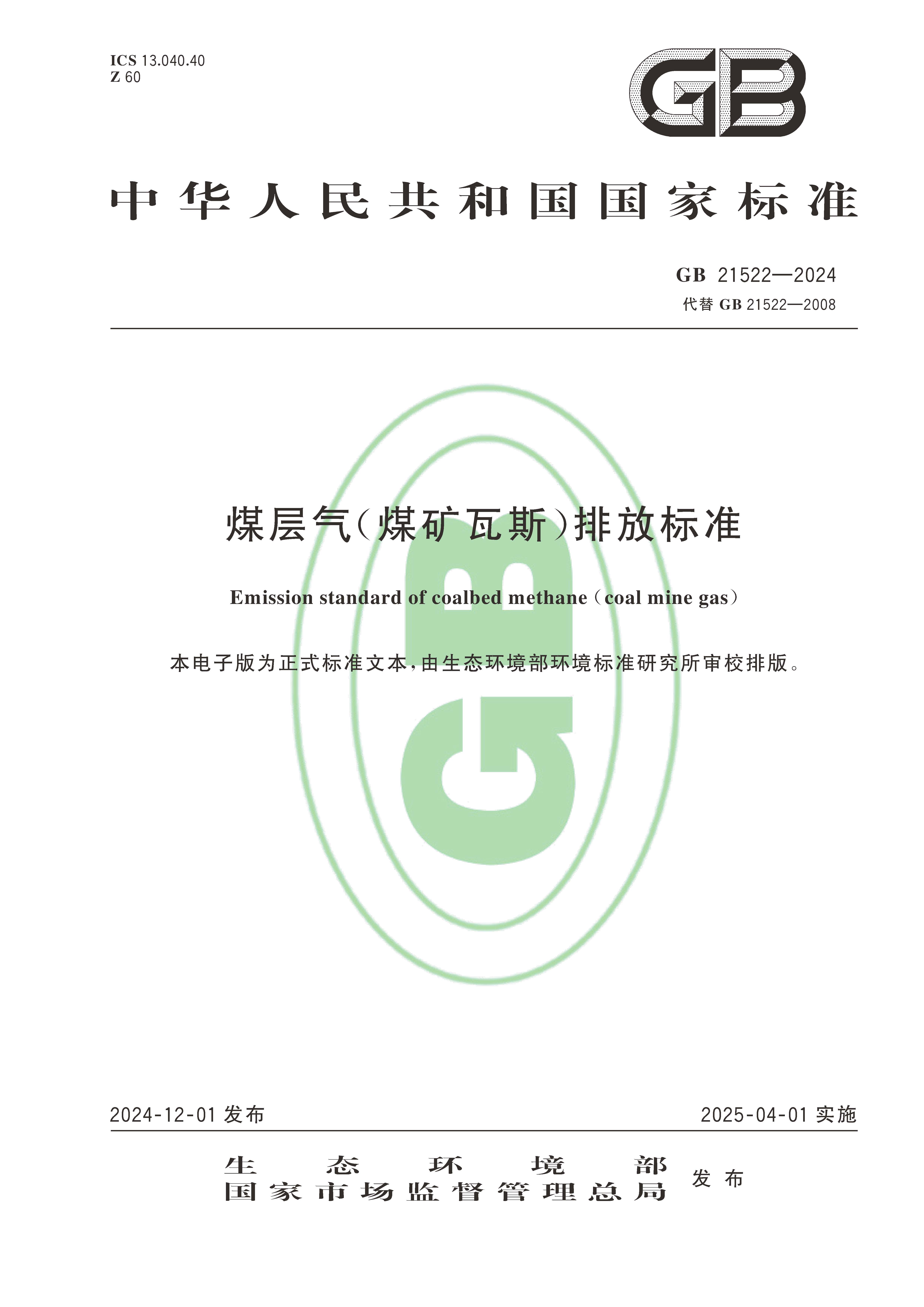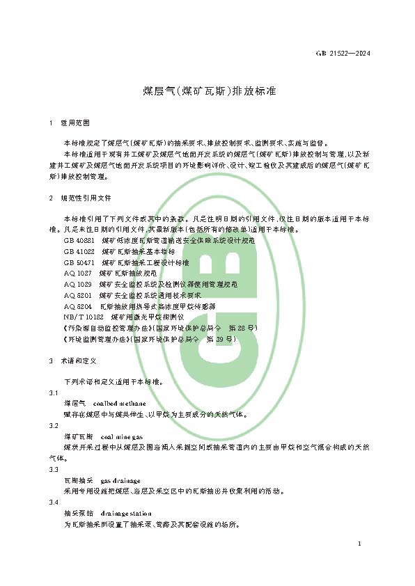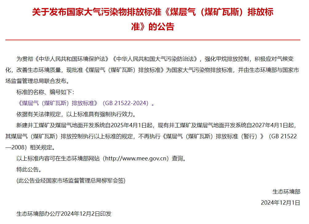 關(guān)于發(fā)布國家大氣污染物排放標(biāo)準(zhǔn)《煤層氣(煤礦瓦斯)排放標(biāo)準(zhǔn)》的公告