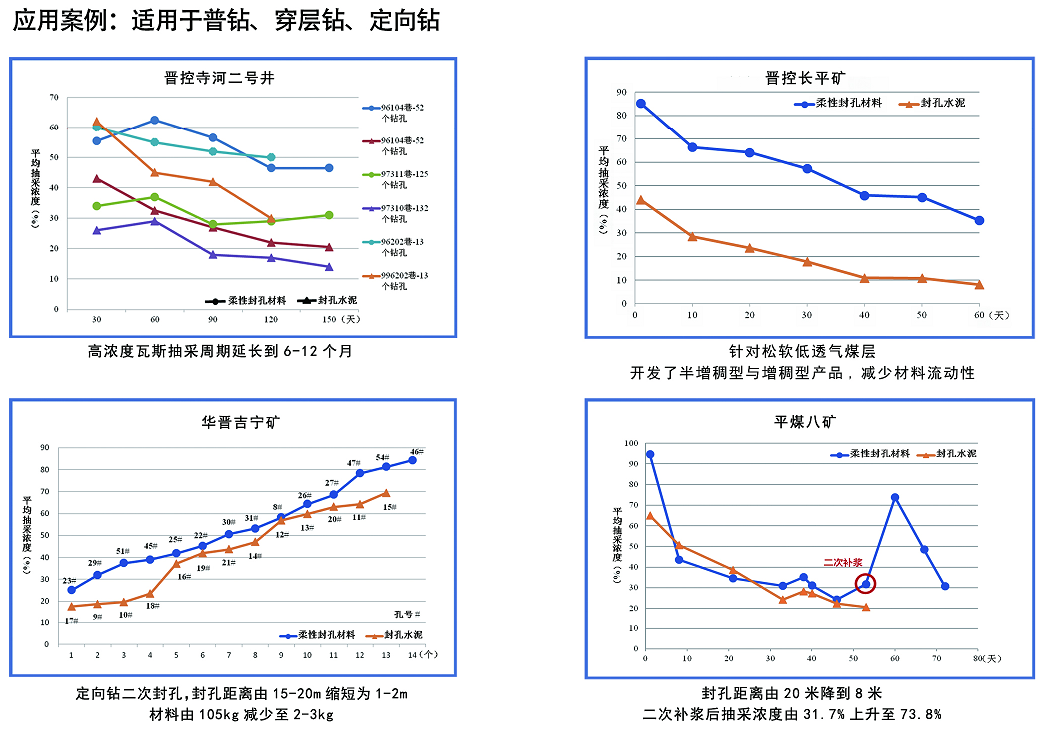 在使用納米擴散膨脹劑(EDA?)材料封孔的實用案例中,顯現(xiàn)以下優(yōu)點:1)提高了瓦斯的抽放濃度,單孔平均濃度從20%~30%提高到40%~80%;2)當抽采鉆孔經(jīng)過幾個月的抽采變成低效鉆孔時,可以采取二次補漿措施變回有效鉆孔,原來的封孔材料則不可以;3)綠色、節(jié)能:施工中納米擴散膨脹劑的使用量是膨脹水泥材料的20%~30%,節(jié)省了井下勞動強度和運輸成本。